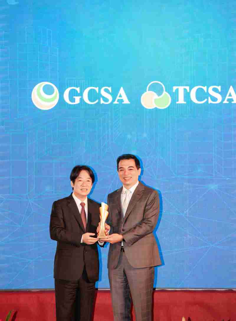 达全方位永续表现获全球永续奖及台湾永续奖肯定,,,由副总统赖清德颁奖 (左),,尊龙集团总经理柯富仁 (右) 代表领奖