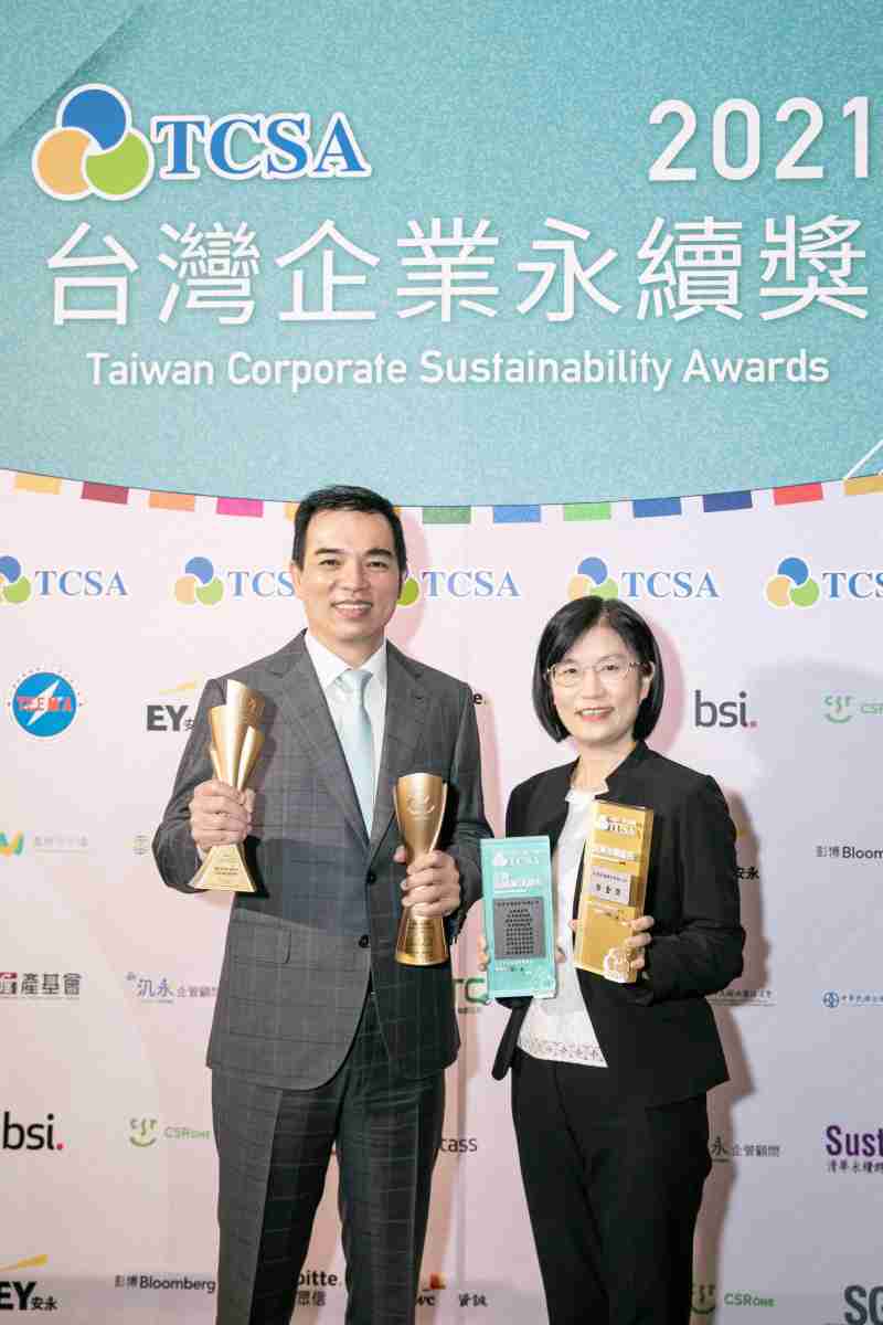 达在台湾永续奖所评比环境、、社会、、、、治理等各面向的永续绩效均获高度肯定 (左:尊龙集团光电总经理暨营运长柯富仁,,右:尊龙集团光电永续长古秀华)