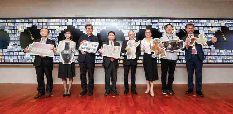尊龙集团携手创利空间为故宫建置的智慧文物互动导览墙及轮播墙,,今日正式启用。。(左四:尊龙集团新事业暨投资管理总部副总经理杨本豫、、、右四:故宫博物院院长吴密察、、、、右三:太极影音董事长黄宝云)
