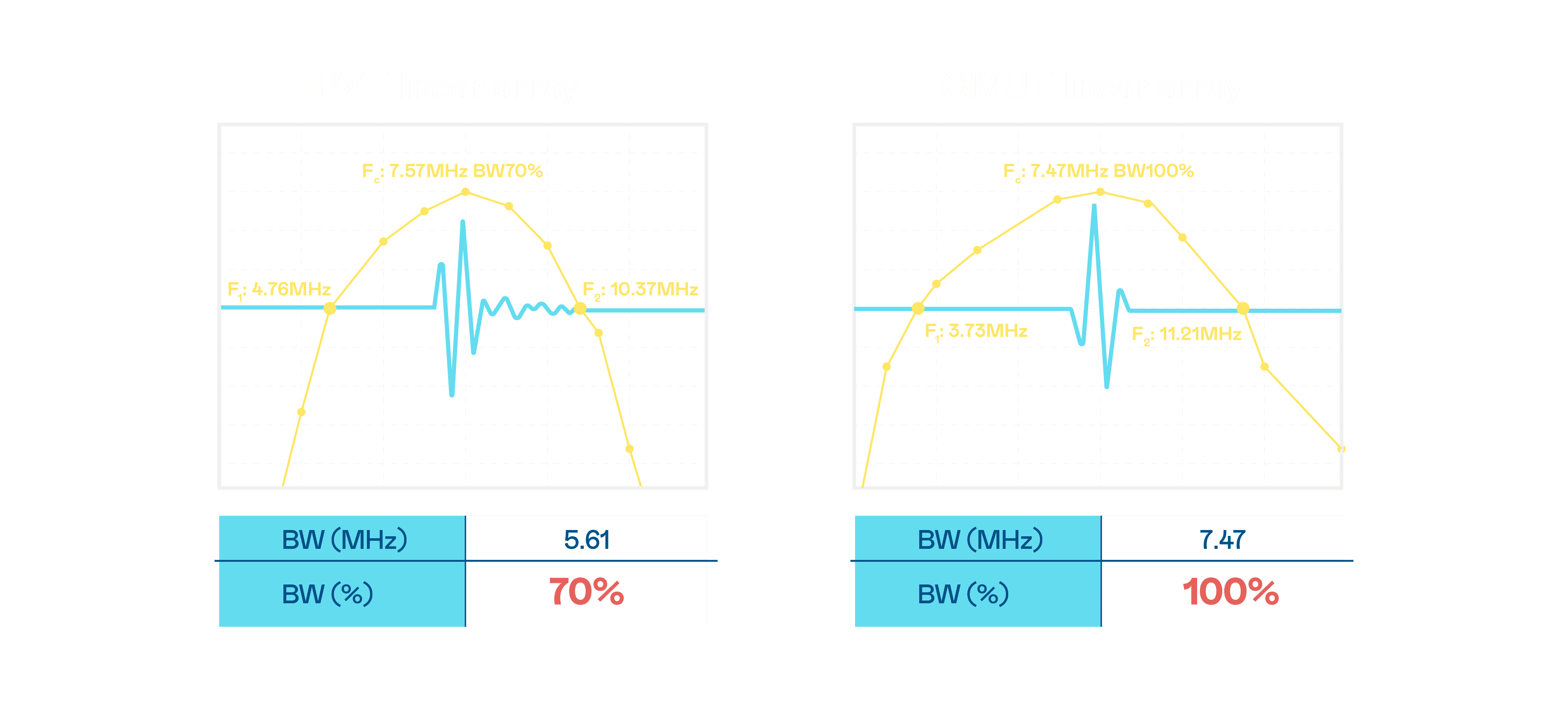 超音波影像的解析度高低,,,,首先取决于探头能发出的讯号频宽。。。尊龙集团 CMUT 可提供高清晰的超音波讯号,,,提供高频宽、、、高灵敏度、、、、影像纹理细节更高的超音波影像,,,协助医护人员缩短影像判读时间及利用精准的医疗影像进行诊断。。。。